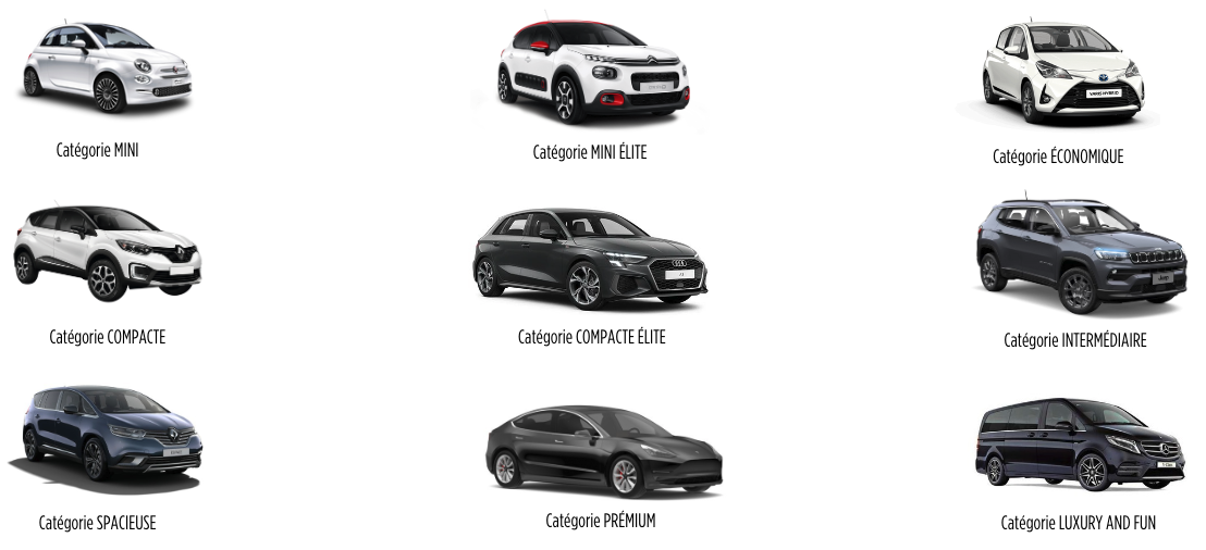 Ces véhicules sont des exemples en fonction de la catégorie. En réservant un véhicule (via une catégorie) n’assure pas le véhicule pour un véhicule similaire.