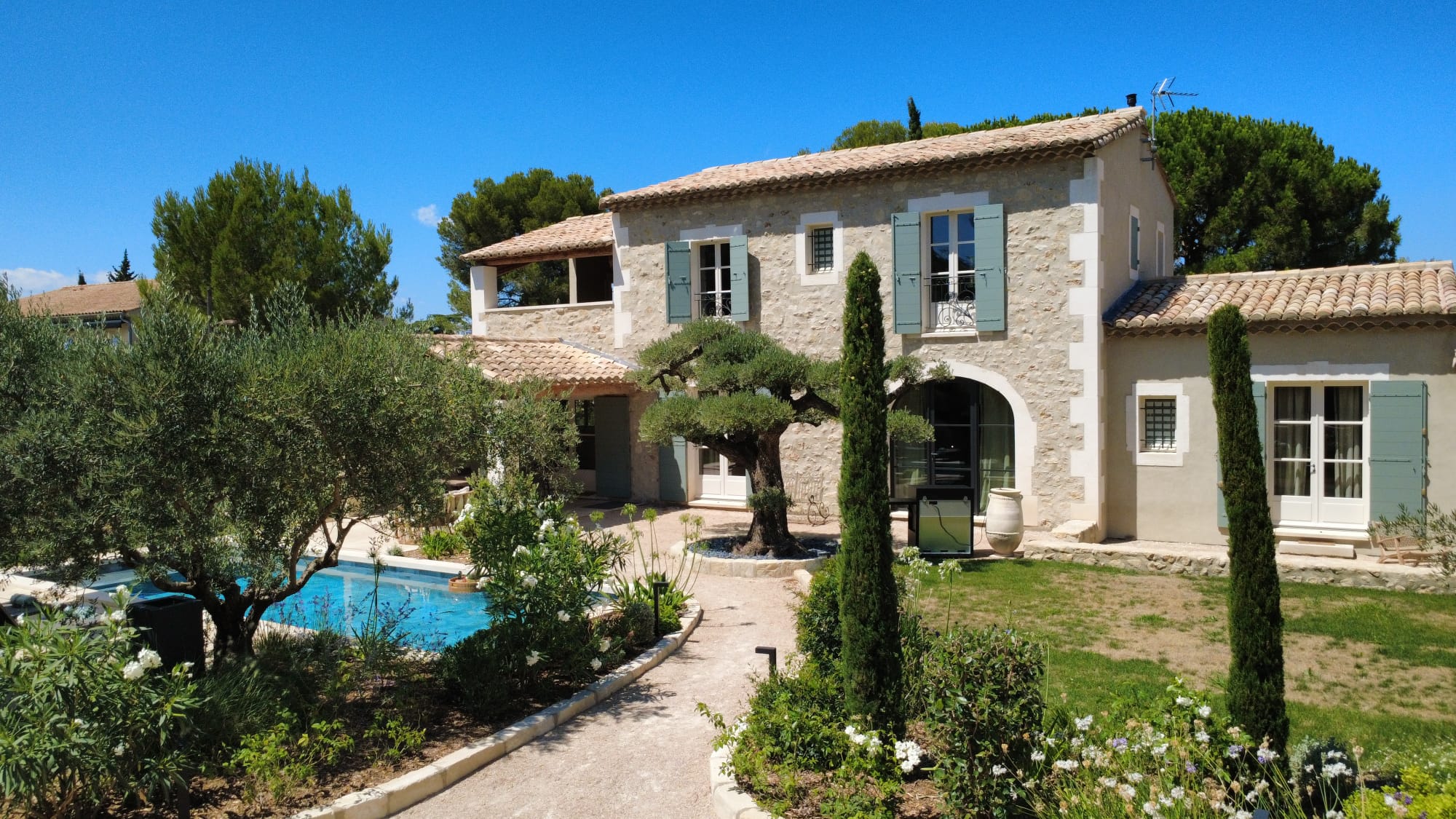 Deux chambres se trouvent au rez-de-chaussée et deux à l’étage, dont l’une donne accès à une vaste terrasse ombragée offrant une vue magnifique sur le jardin. La cuisine entièrement équipée est complétée par une arrière-cuisine et une buanderie, tandis qu’un WC est également disponible au rez-de-chaussée. L’espace de vie comprend un salon spacieux et une salle à manger confortable.